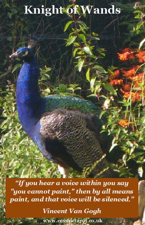 The Knight of Wands is a peacock. The male peacock is a flamboyant bird; his feathery frock is a mix of dazzling blues, greens, specks of yellow/gold, black and greys.